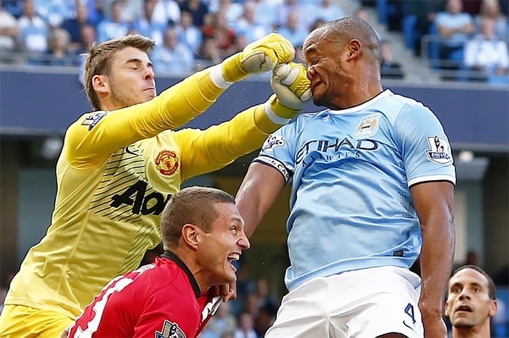 In diesem Fall deutet alles darauf hin, dass De Gea den Fauxpas begangen hat, als er versucht hat, Kompanys Kopf mit dem Ball zu verwechseln, obwohl das der Verteidiger nicht wertete. Das Endergebnis? Ein wilder Zusammenprall und ein übler Brummschädel für Kompany.