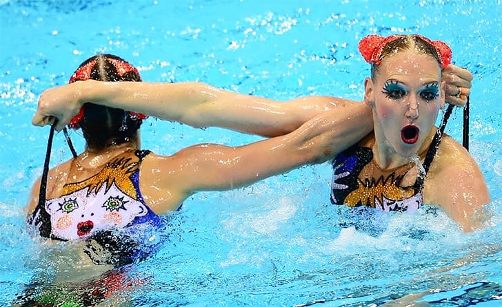 Das Foto von diesen beiden jungen Damen, die sich bei der Auswahl ihrer Frisur und ihres Make-Ups besonders viel Mühe gegeben haben, ist schon einzigartig.. Dieses Foto wurde während eines Wettbewerbs im Kunstschwimmen geschossen. Doch wie schaffen es die beiden sportlichen Damen, trotz Wasser jedes Mal gut auszusehen? Klar, sie verwenden wasserfestes Make-Up. Es schützt das Make-up vor dem Wegrinnen und bewahrt dabei die Schönheit des Antlitzes.