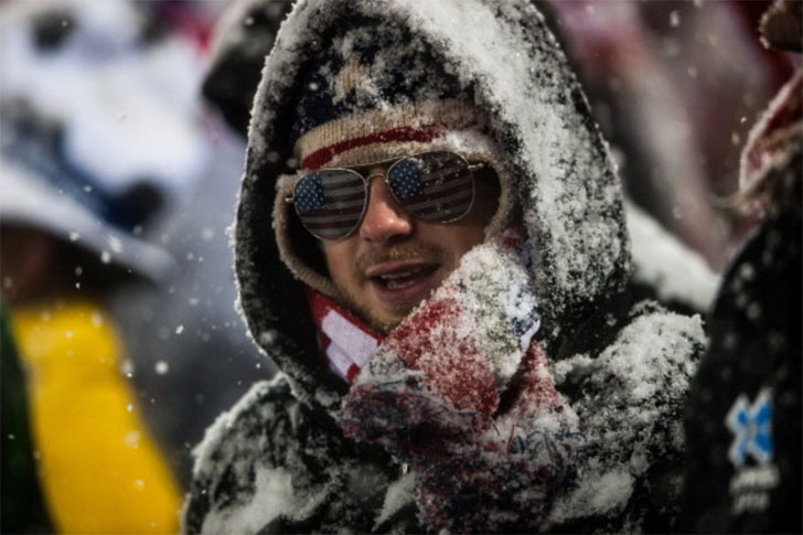 Esse cara parece estar vestido da cabeça aos pés de vermelho, branco e azul, e eu realmente espero que ele também esteja usando ceroulas com as cores da bandeira americana, bem forradas. O futebol é um jogo que, idealmente, é jogado em clima quente. Mas esse torcedor americano não parece se importar, e podemos vê-lo enfrentando os elementos com muita garra para garantir o ânimo e a vitória do seu time!