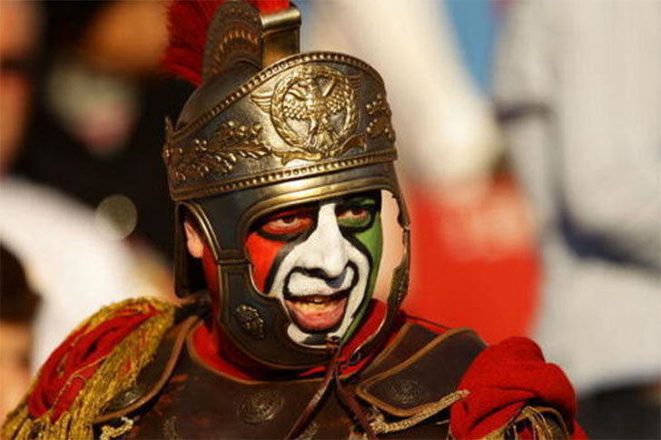 Ele pode não ter lutado no Coliseu de Roma, mas esse torcedor italiano fez questão de vestir essa fantasia impressionante para ajudar a mostrar seu amor pela Azzurra.