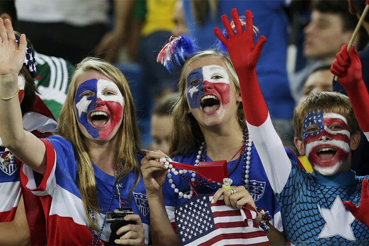 Essa loirinha dos EUA que vemos à direita optou por um penteado descolado para mostrar seu apoio ao time de futebol americano. Além da camiseta de seu país, de sua cara pintada com as cores da bandeira americana, seu penteado com longas penas coloridas definitivamente chamou a atenção da câmera e do público. Linda!