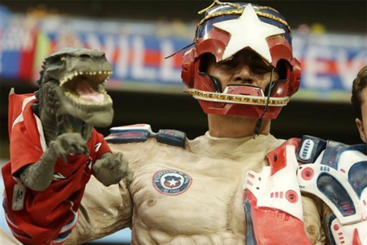 Dá para apreciar o esforço deste torcedor para apoiar o seu time – o chileno – mas ele também parece bastante assustador, com esse torso enorme, capacete e segurando um T-Rex. Eu não gostaria de esbarrar com ele se fosse do time contrário. E se eles estivessem perdendo…