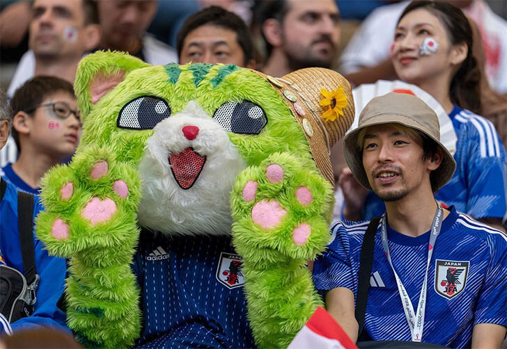 Um gato verde e gigante: é assim que um torcedor do Japão acompanha a seleção no Qatar. Sabemos que eles consideram que os gatos trazem sorte, mas um gato verde? Bom, ideias malucas é que não faltaram para se destacar no humor e na torcida pelo seu time.