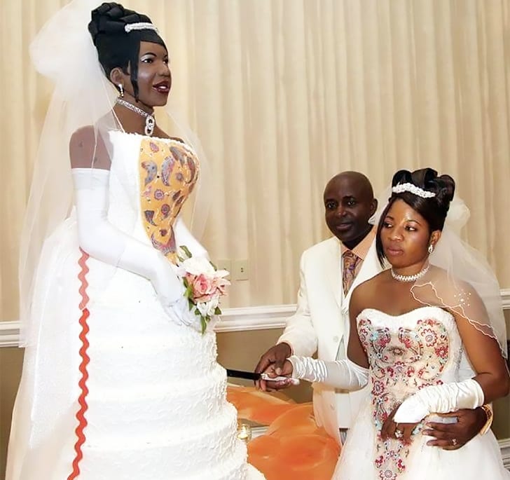 Este casal comemorou uma década de casados com um bolo notável e deslumbrante. A peça, com cerca de um metro e meio de altura, era uma cópia fiel da noiva em seu traje feito de sabor crocante e argila polimérica. Com seis camadas e pesando aproximadamente 180 quilos, o bolo era uma visão impressionante.
