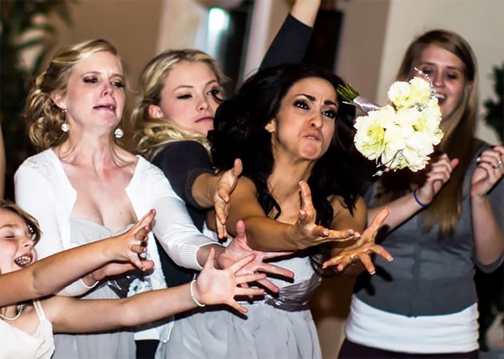 É uma atividade divertida para as noivas celebrarem suas amigas solteiras e desejar-lhes sorte no amor. Naturalmente, todas essas mulheres na foto estão ansiosas para pegar o buquê. Mas adivinha? Assim que o buquê é lançado, estas amigas da noiva ativam seu animal interno e perseguem aquela coisa com a mesma determinação com que uma chita caça uma gazela no Serengueti. Superstição ou não, essas mulheres não suportam mais ficar solteiras.
