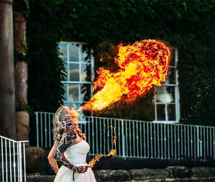 Artista de circo, nossa noiva poderosa queria que suas fotos de casamento refletissem sua personalidade dinâmica e, é claro, seu espírito audacioso. Graças ao fotógrafo, o resultado é mágico. Essas fotos únicas são um testemunho de seu espírito intrépido e seu amor pela aventura. Esta deve ser uma das melhores imagens da nossa lista e ter uma namorada assim, significa que também há um namorado orgulhoso. Trate-a bem, amigo, porque você não vai gostar de estar do outro lado do fogo.