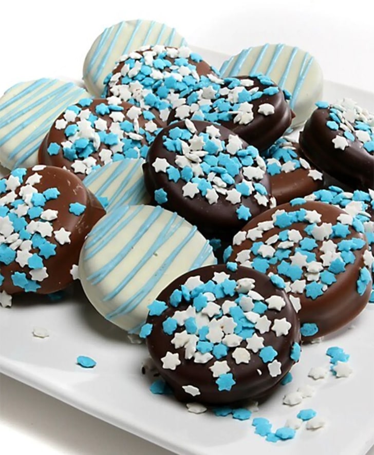 Dive into a delicious twist on a classic treat with the Chocolate Covered Company’s Hanukkah-themed Oreo Cookies. They’re a festive fusion of flavor and fun. Each Oreo is drenched in rich chocolate and adorned with Hanukkah-inspired decorations, making them as delightful to look at as they are to eat.