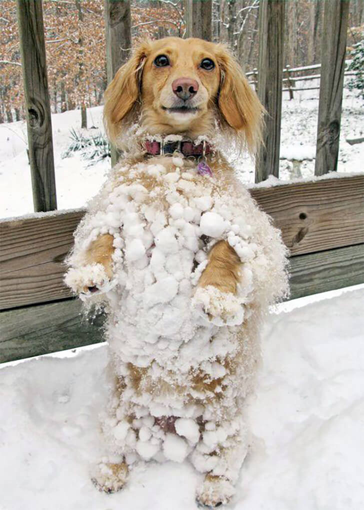 A dog stands upright on its hind legs, looking directly at the camera amidst a snowy setting. The hilarious part is its body, dangling with ice! To remove ice from a dog’s coat, gently use warm (not hot) water to melt the ice, and then dry the fur with a towel. Avoid using hair dryers on high heat to prevent skin burns.