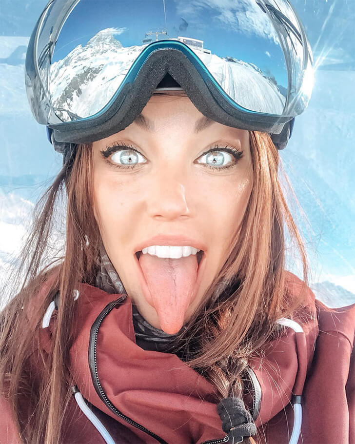 In this photo, an attractive young woman with striking blue eyes and long auburn hair playfully sticks out her tongue. Perched on her head are reflective ski goggles, mirroring the breathtaking snowy mountains around her. Clearly, she’s enjoying a fun-filled ski or snowboarding adventure.