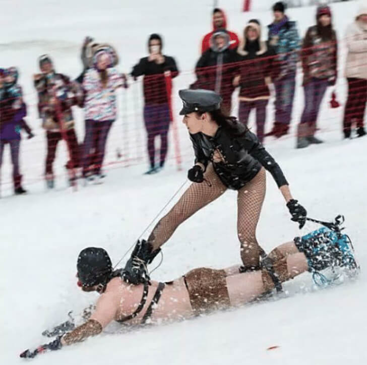 This scene is a wild one: a woman using a man as her snowboard! With strings attached to him, it looks like she’s controlling her ride. She’s in a black leather one-piece and fishnet stockings, while he’s braving the cold in just leather shorts. It’s bound to be freezing for him, with his bare body against the snow.