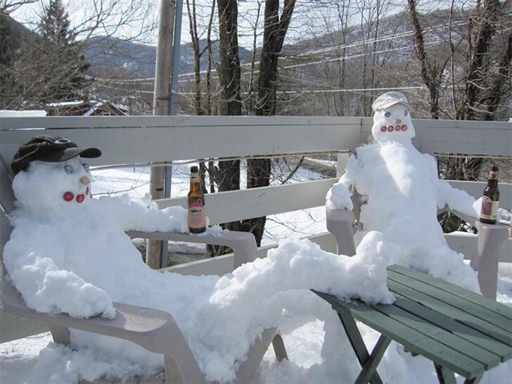 Two snowmen lounge comfortably against chairs, one casually placing his leg on a wooden table. Each holds a beer bottle, looking like two friends chilling on the porch. With caps on their heads and bottle caps for faces, these snowmen are cleverly crafted.