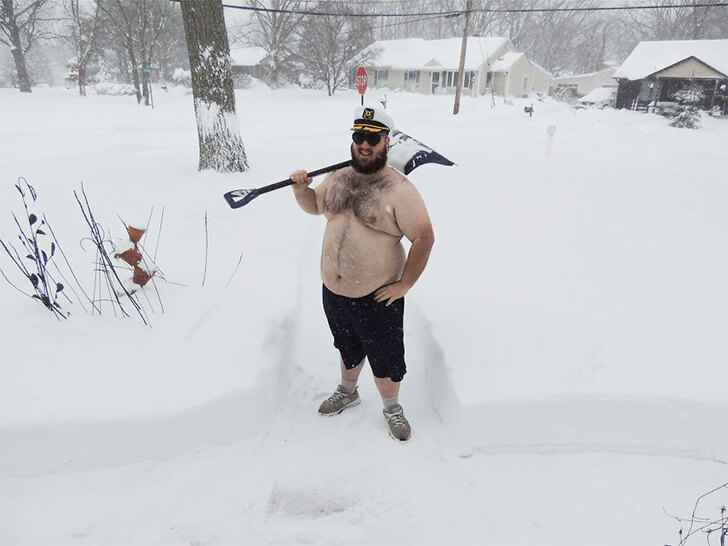 A topless man in just black shorts stands confidently in a snowy area, a shovel casually slung over his right shoulder, and a captain’s cap perched on his head. This scene likely captures someone tackling the cold in a playful manner with some neighbors perhaps reminding him that he could get sick.