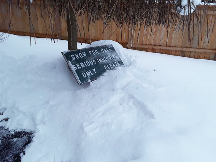 A signboard reading “Snow for sale serious buyers only” being almost covered in thick snow is pure irony and hilarity. It’s funny because it pokes fun at the abundance of snow, suggesting selling something that’s already overly plentiful.