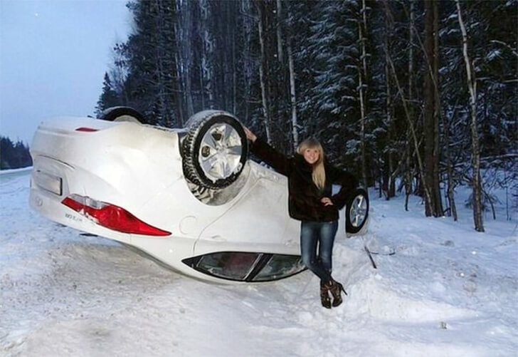 A blonde woman poses cheerfully by her white car, which has flipped over, likely due to slippery terrain. Amidst the thick woodland, her smile contrasts with the snowy surroundings as she clutches the rear wheel of the upturned vehicle. Roads can indeed become treacherously slippery during winter due to ice and snow, leading to accidents.