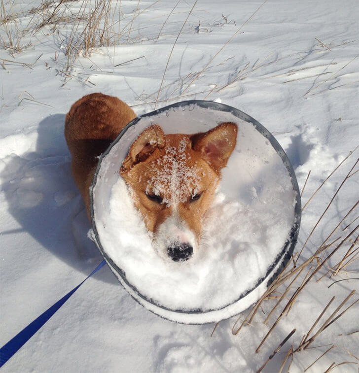 A corgi, undeterred by the Elizabethan cone on its head, enjoys playing in the snow, resulting in snow accumulating inside the cone. The Elizabethan cone, or E-collar, is used to prevent dogs from licking or biting wounds, allowing them to heal properly. Despite the cone, this corgi’s enthusiasm for snow shows its playful spirit.