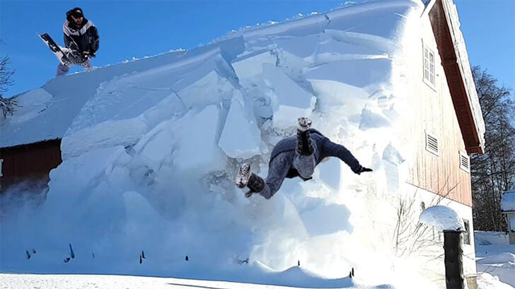Two guys shoveling snow off a roof suddenly find themselves in a dramatic situation. An avalanche sweeps one off his feet, launching him mid-air in a startling descent, while his companion remains on the roof, frozen in horror. Thick blankets of snow can indeed damage roofing. The weight of accumulated snow can strain the roof structure, leading to leaks, collapses, or other damage.