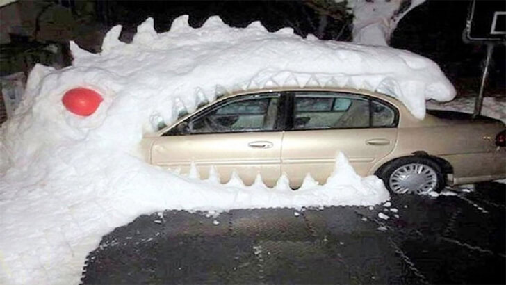 Transforming a snow-covered car into a spectacle, someone’s creativity has given birth to a giant white dinosaur, crafted meticulously from the snow itself. With menacing red eyes, this Snowasaurus stands as a testament to winter’s artistic potential. The car, ingeniously placed in the gaping maw of this frosty beast, appears to be on the verge of being swallowed whole.