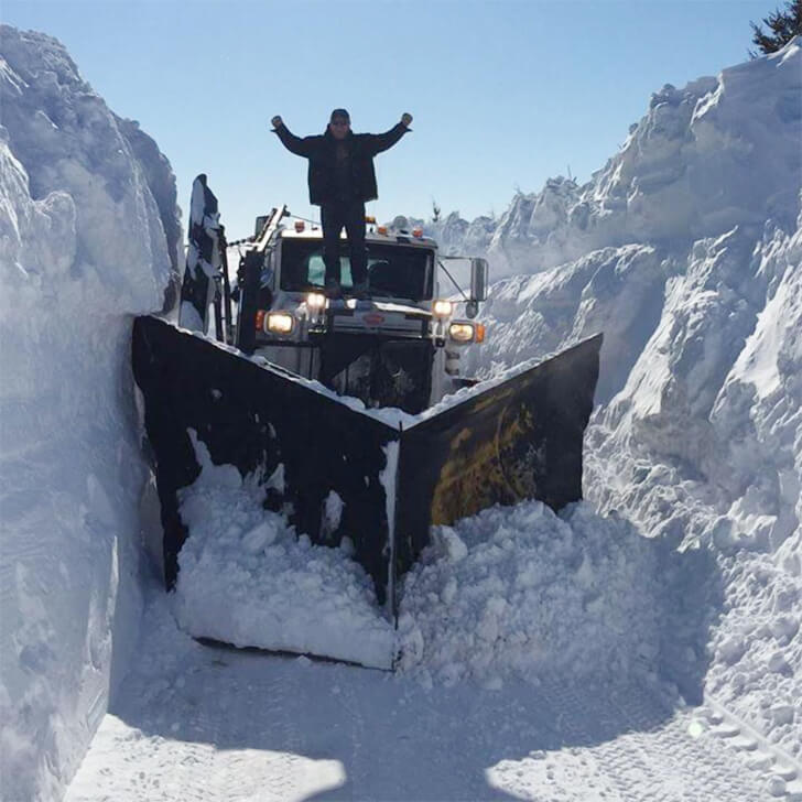 Is this a snow apocalypse? This man seems to be the king of the snow because he can tame it! Kidding aside, this man, dressed in black, stands triumphantly on a plow truck’s bonnet, nestled between two towering snow hills. His arms stretched out in celebration, he revels in his accomplishment of path clearing.