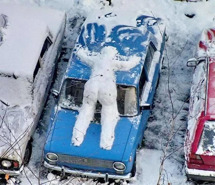 Snowman Dive on a Blue Car Among the three parked cars, a blue vehicle grabs attention with its snowman. Unlike traditional round and upright figures, this snow creation looks as if someone took a plunge from above, landing sprawled on the bonnet, windshield, and roof. If a person were to actually fall onto a […]