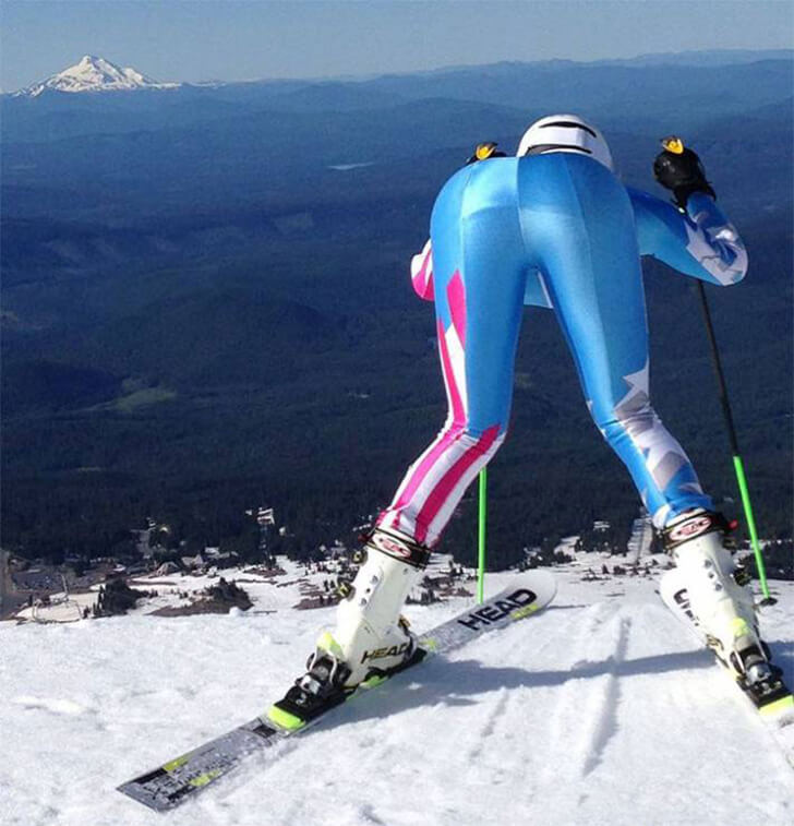 Julia Marie Mancuso, an American World Cup alpine ski racer, is captured mid-glissade. Bent at the hips in an athletic stance, her back to the lens, she wears a blue and pink one-piece suit.