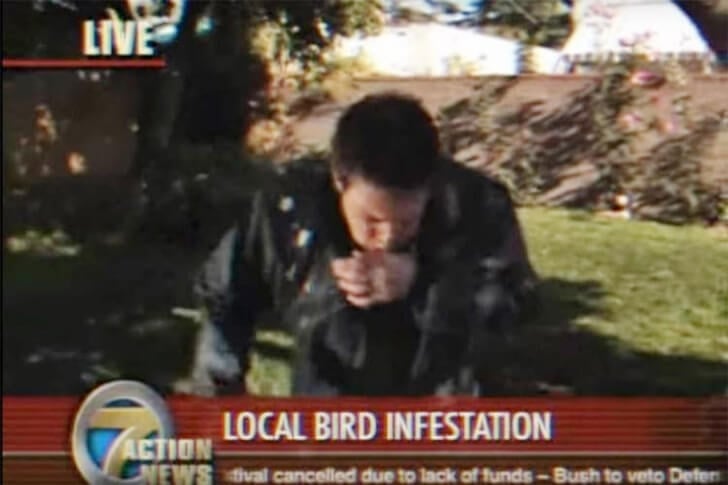 Cuando un reportero decidió informar sobre una multitud de pájaros, pensó que caminar bajo un árbol repleto de ellos sería una gran idea. Quizás los pájaros, enfadados por algún comentario desafortunado sobre ser una plaga, decidieron dar su respuesta.