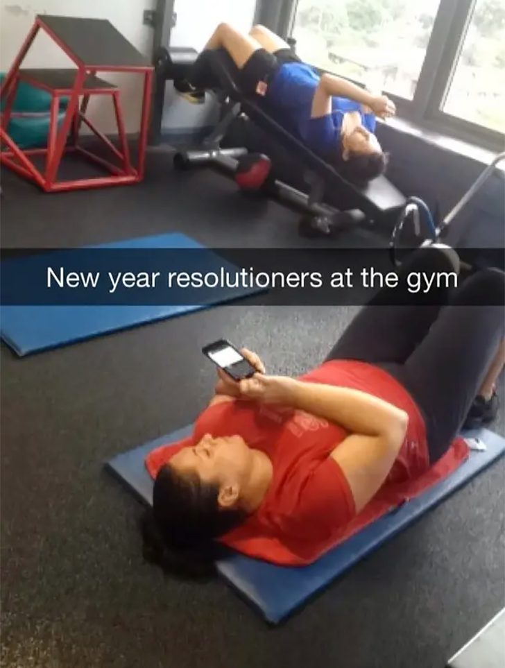 Gym memberships often surge at the start of the year, reflecting the burst of enthusiasm tied to New Year resolutions. This increase embodies the common goal of getting fit or losing weight—usually a top resolution for many. The women in the photo, sprawled across the floor and a weight bench while engrossed in their phones, offer a playful nod to this annual phenomenon.