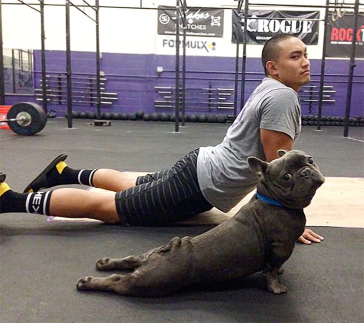 Pets often mirror their owners’ actions due to their strong bond and the desire to engage in shared activities. This phenomenon is evident here, as a French bulldog and his owner perform cobra stretches together, showcasing a delightful synchronization of posture and expression.