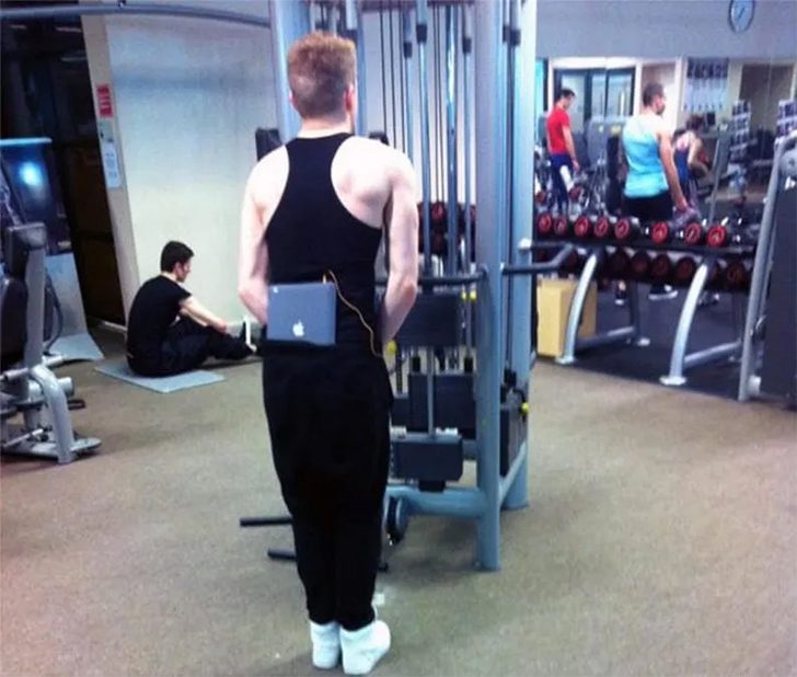 At the pulley machine, a man innovates by tucking his iPad into the back of his track pants, with earphones connecting him to his device. This unique setup invites a myriad of potential mishaps, from accidental disconnections to the iPad taking an unexpected tumble during an intense session.