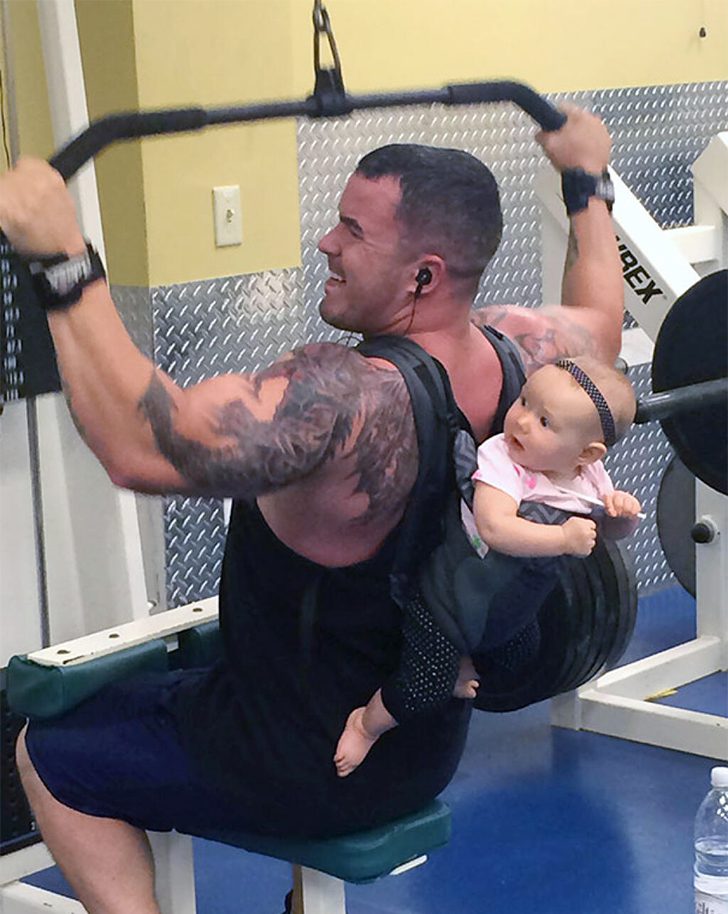 Dad takes multitasking to a new level, effortlessly doing pull-ups with a baby securely strapped to his back. The curious little passenger peeks over his dad’s shoulder, eager to learn the ropes of physical fitness from an early age. This scene illustrates a creative way for parents to incorporate their children into their exercise routines, fostering a bond while promoting a healthy lifestyle.