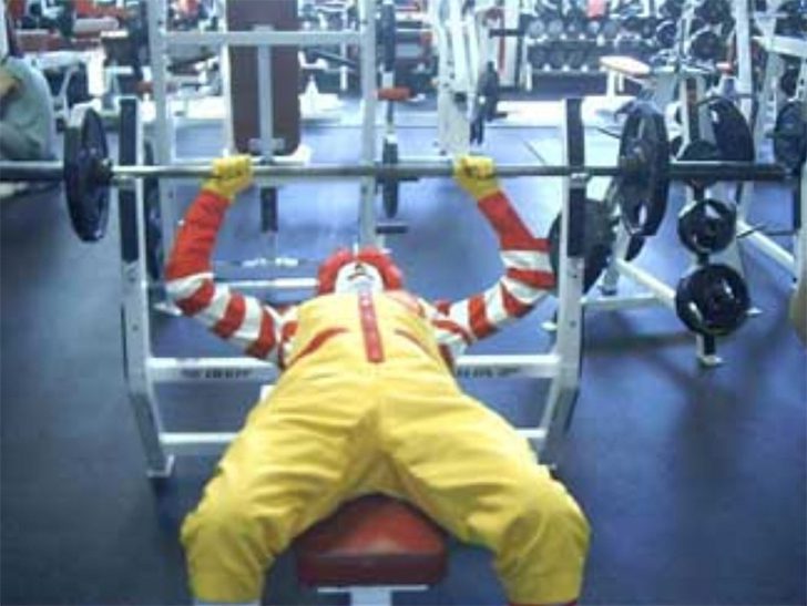 Even fast-food mascots know the importance of a balanced lifestyle. Ronald McDonald, traditionally seen enticing customers with burgers and fries, switches roles to champion weightlifting at a bench press. This unexpected athlete in clown attire suggests that everyone, no matter their day job, can embrace health and strength training.