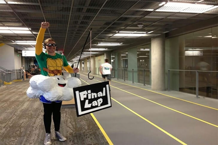 Channeling the spirit of Mario Kart, a man brings a slice of the iconic game to life at his local gym. Dressed as a beloved character from the game, he boosts morale by holding a “Final Lap” sign, cheering on his fellows as they push through the last stretch of their workouts.
