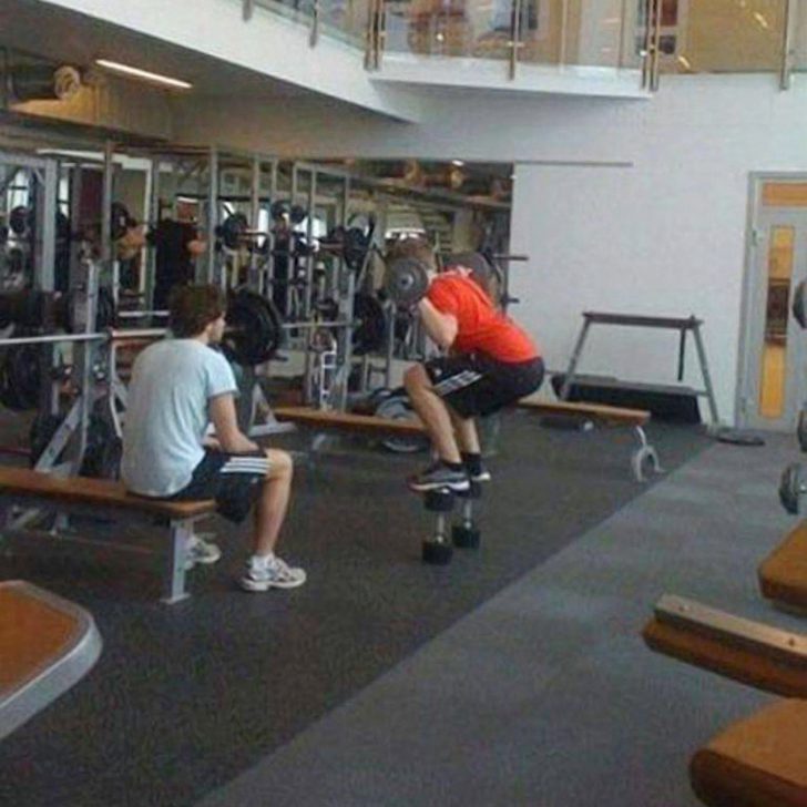A man takes gym creativity to new heights, balancing precariously on two dumbbells while engaging in a squatting and weightlifting routine. His friend, seated nearby, seems more entertained than concerned even though this balancing act introduces significant risks of injury. While impressive, it’s unadvisable due to the unstable foundation and increased likelihood of a fall, especially under the strain of additional weights.