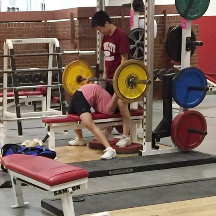 He is just standing with an air of detachment as the lifter’s head awkwardly positions between his legs, directly under his groin. This visual gag underscores the critical role of spotters in providing both safety and support, ensuring lifters can push their limits without the risk of injury.