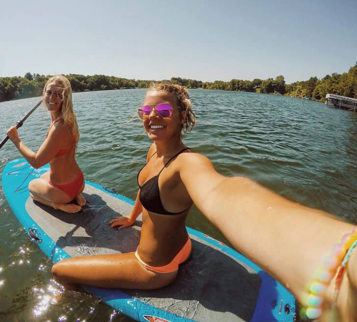 Her companion in the front, adorned in a red bikini, turns with a beaming smile and flowing blonde hair, perfectly photogenic. Paddleboarding, often a tranquil dance with the water, here doubles as a floating photo studio. Their phone, likely water-resistant, becomes an essential tool for documenting these sun-kissed memories, blending adventure with a dash of social media savvy.