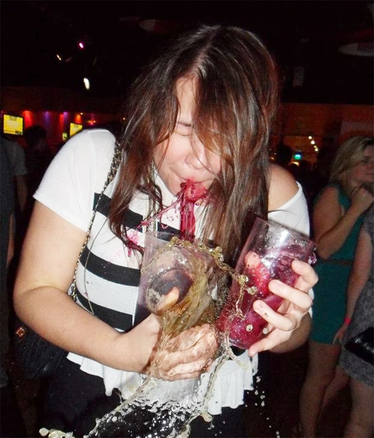 When it comes to perfectly timed club photos, this is one of the best ones yet. We guess the bar was probably closing, and she had to rush for their drinks. Unfortunately, she spilled all three but gave us this hilarious picture.