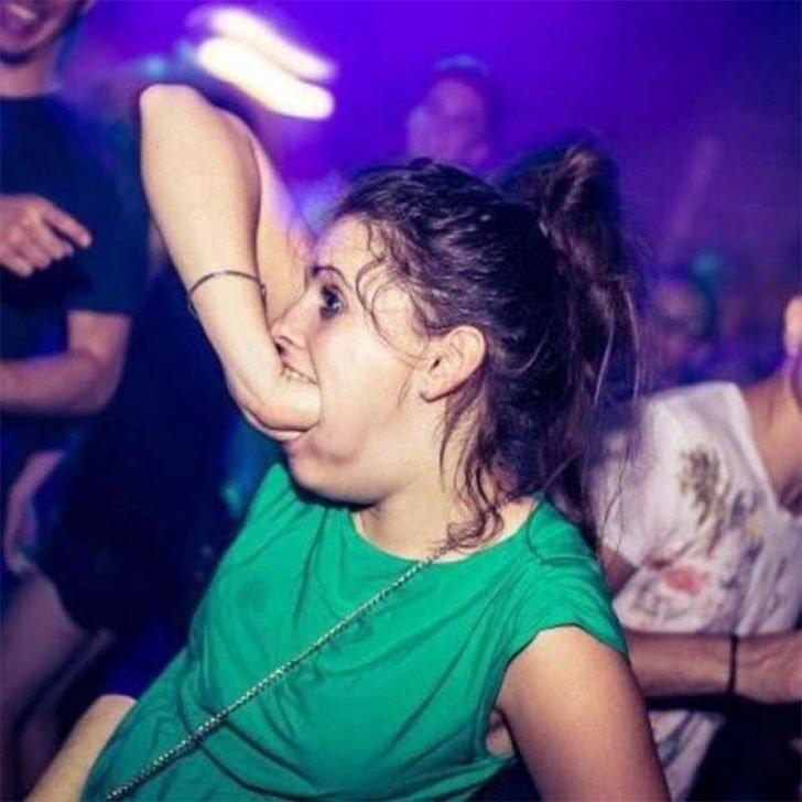 It looks like this woman was just about ready for her post-clubbing midnight burger and fries, and she ended up putting her hand in her mouth. While snacking as you drink is advisable since it can help digest the alcohol faster, this is definitely not what that means. How did she manage to do that, anyway?