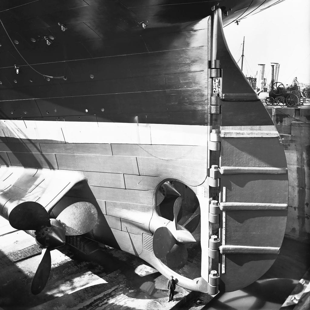 Ovviamente una nave di dimensioni cosi considerevoli doveva necessariamente essere dotata di un timone pari requisiti. La sua altezza in effetti arrivava a circa 24 metri per un peso che raggiungeva le 90 tonnellate. Come è possibile alzare un peso del genere durante la fase di costruzione? Possiamo immaginare le evidenti difficoltà logistiche che hanno avuto i costruttori, considerando che stiamo parlando di una nave progettata agli inizi del ‘900. Possiamo vedere dalla foto le proporzioni tra un uomo e la porzione di nave presa in considerazione: immaginate le suddette proporzioni rispetto la nave intera!
