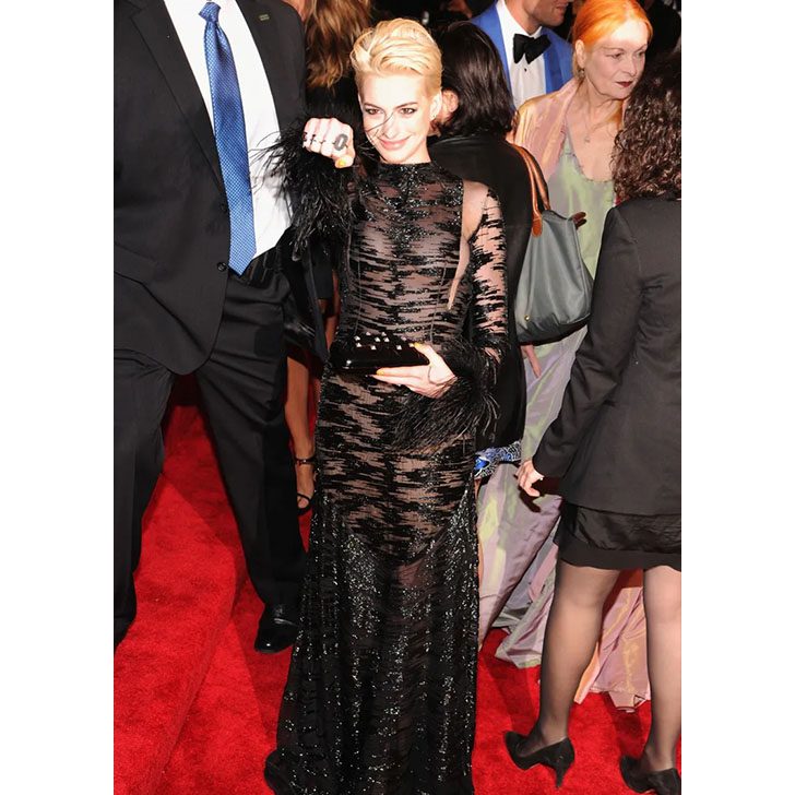 Anne Hathaway stole the show at the 2013 Met Gala, channeling the rebellious spirit of punk rock royalty. Her choice of a vintage Valentino gown was bold, exuding a sense of daring allure. The dress’ sheer fabric contrasts with her Debbie Harry-inspired blonde hairstyle, creating an air of defiance.