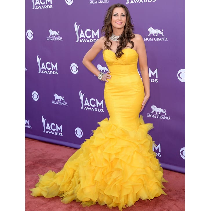 With the radiance of the sun itself, Danielle Peck graced the red carpet at the ACM Awards. Instead of the usual sequins, she opted for a mesmerizing mermaid gown that mirrored the colors of a summer daydream. The vibrant yellow ruffles cascaded down her figure, and bold hue of her dress only served to enhance her dazzling smile.