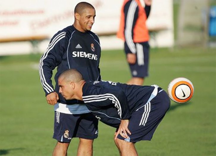 Two Brazillian players Roberto Carlos and Ronaldo Nazario goof off during a practice session. These two players are both wearing jerseys with the logo of Real Madrid. Nazario played for the club from 2002 to 2007 while Carlos played from 1996 to 2007. Together, both of them helped guide Brazil to victory in the 2002 World Cup.