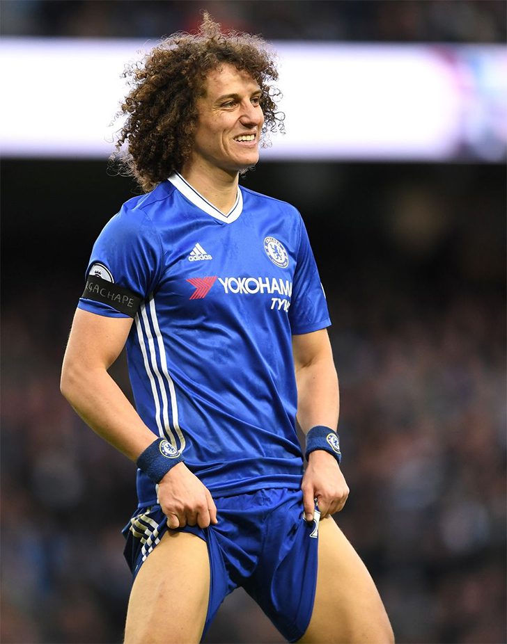 This image features David Luiz as he lifts his shorts to put his thighs on full display. Maybe it was a celebration after scoring, or maybe he was very proud of the definition brought to his muscles by his workout routine. In the photograph, Luiz wears a Chelsea jersey.
