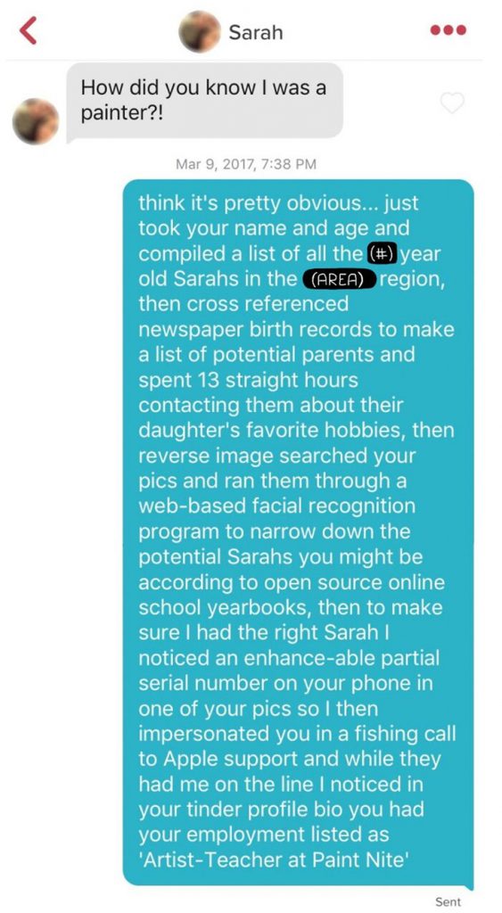 In this case, all this young chap did was collect extensive data on possible Sarahs that could be art teachers. It was even more hilarious because the information he needed was staring him right in the face on her profile.