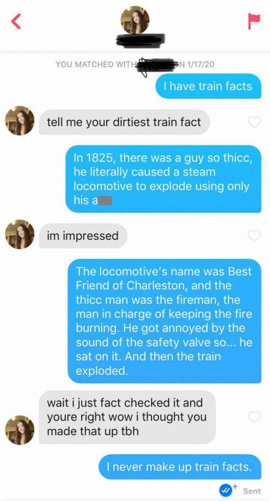 We guess this Tinder user realized the statistics were in favor of intelligent people, so he decided to up his game by adding to his knowledge. He chose quite a fascinating topic too; the railway. We’ve got one railway fact for you. Did you know that in 2017, the entire worldwide rail transportation network had over 851,000 miles of railroad tracks?