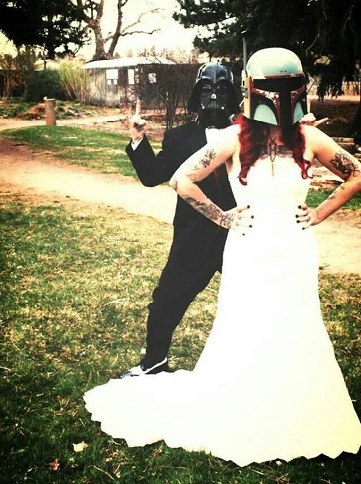 Star Wars é uma franquia de sucesso em que 9 em cada 10 pessoas gostam. E vemos que volta e meia nas festas a fantasia pessoas se vestem a caráter seja de jedi, Darth vader, e Luke. E quando os noivos são apaixonados pela série? Na foto vemos os noivos tirando foto com os capacetes específicos do filme. Eles com certeza podem tudo né. Que a força esteja com eles.