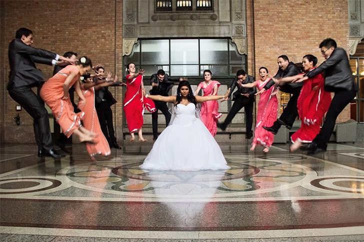 Uma noiva com poderes especiais.Tudo bem que a mulher tem seus poderes e ainda mais no casamento. O noivo provavelmente não ia gostar muito disso. Nessa belíssima foto, uma brincadeira muito bem feita mostra a noiva como se tivesse poderes paranormais de super heroína capazes de fazer os padrinhos voarem para longe. Imagina só ter esse poder quando o marido não lavar a louça, por exemplo.