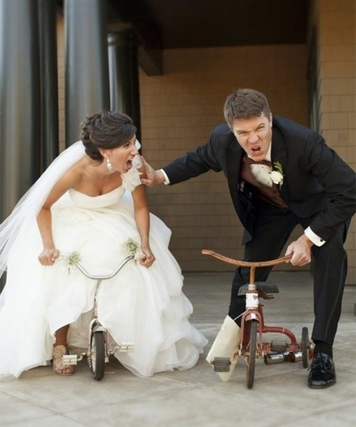 Olha que coisa fofa. Os noivos queriam ir embora da própria festa para aproveitar a lua de mel e não tinham transporte mais apropriado para o tal feito. Encontraram apenas duas bikes de criança e resolveram arriscar. Não sabemos se conseguiram ir embora com elas, mas para tirar a foto ficou super legal. Que sejam muito felizes.
