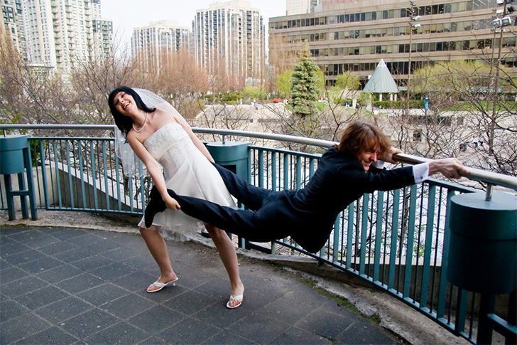 Outra foto que vemos o noivo “sofrendo” por ter se arrependido em casar. A noiva que não é boba nem nada puxa ele que está se prendendo na grade da varanda. Fotos como essa estão se tornando rotina em álbuns de casamento.Mais eu pergunto: Eu acho engraçado mas total deselegante da parte do noivo, mostrando que só ele que se arrepende. E a noiva não se arrepende de ter se casado com um sapo?
