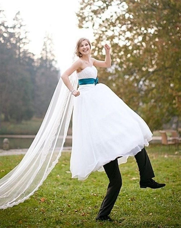 Aqui vemos nessa foto super engraçada a noiva de calça preta meio estranha, andando no gramado. Com certeza foi uma montagem bem elaborada. Acredito que seja a perna do noivo entrelaçada num photoshop bem feito. Ficou muito legal. Essas fotos realçam a criatividade dos fotógrafos que estão cada dia mais criativos.