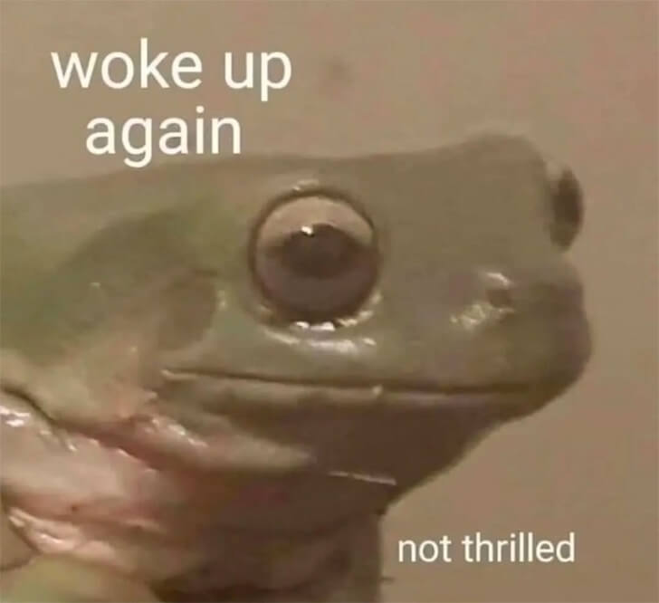 Dieses Meme schreit förmlich “Ich brauche fünf Espresso und eine Therapiesitzung, bevor ich mit irgendjemandem rede”. Perfekt für alle, die sich fühlen, als wären sie gegen ihren Willen aus der Winterstarre geholt worden. Zeit, es in jede WhatsApp-Gruppe zu spammen, in der Leute zu enthusiastisch “Guten Morgen!” schreiben.