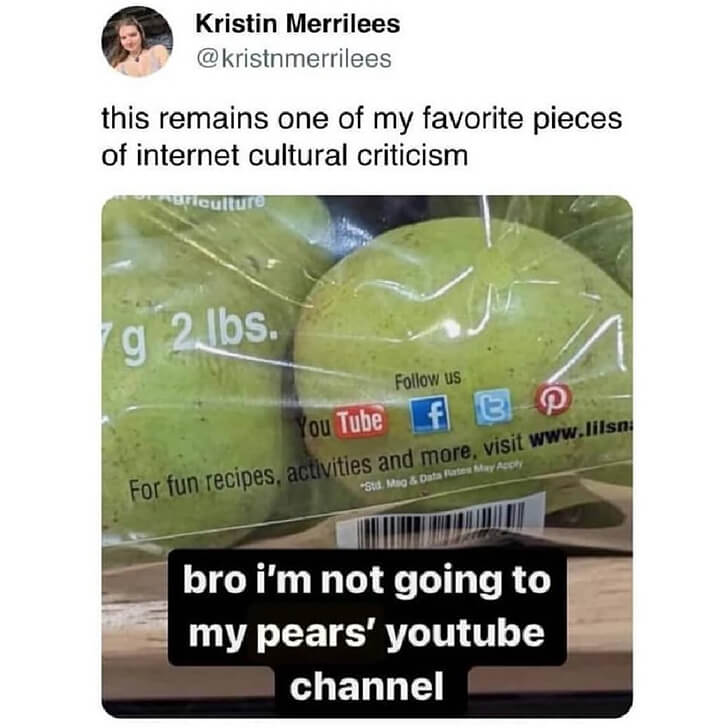 Okay, aber warum versuchen diese Birnen härter, eine Social-Media-Präsenz aufzubauen, als wir? 😂 Dieses Meme ist der Gipfel des Spätkapitalismus trifft auf absurden Humor, und wir leben total dafür. Stellt euch vor, wir scrollen durch YouTube und sehen “NEUES BIRNEN-UNBOXING (WIRD SAFTIG)” in unseren Empfehlungen.